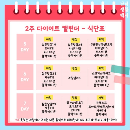| 아침 | 삶은 달걀 2개, 닭가슴살 100g, 방울토마토, 블랙커피 | 300kcal |