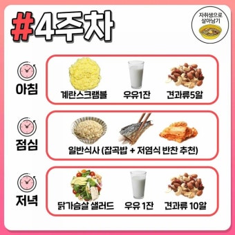 | 월요일 | 닭가슴살 + 삶은 달걀 + 샐러드 | 유산소 1시간 + 가벼운 근력운동 |