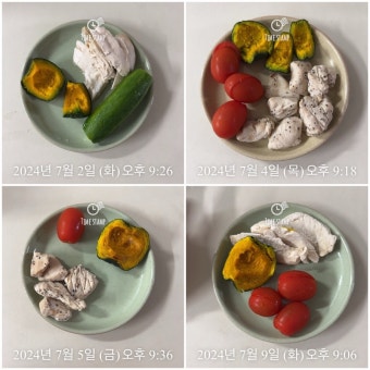| 금 | 고구마 + 삶은 계란 + 방울토마토 | 닭가슴살 비빔밥 | 샐러드 + 두부스테이크 | 저지방 치즈 |