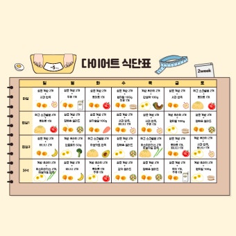 | 월 | 삶은 계란 + 오이 | 닭가슴살 샐러드 + 발사믹 소스 | 고구마 + 두유 |