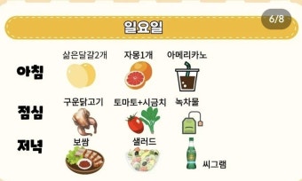 - 아침: 삶은 달걀 2개 + 블랙커피(무첨가)