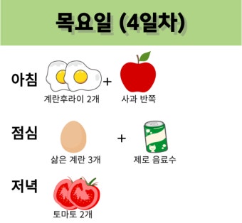 목요일은 진짜 다이어트의 승부처입니다. 탄수화물 의존에서 벗어나는 날이죠. 이 날을 잘 넘기면 체중이 눈에 띄게 줄어드는 것을 느낄 수 있습니다.