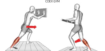 - 뒤에 있는 다리의 발꿈치를 바닥에 붙이고 몸을 앞으로 기울입니다.