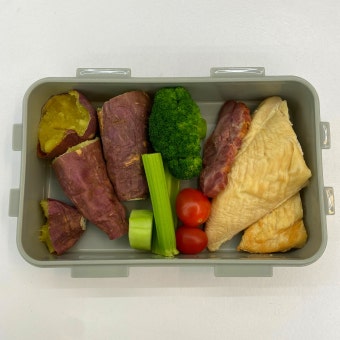 - 닭가슴살 샐러드 + 고구마 1/2개 + 삶은 달걀 1개