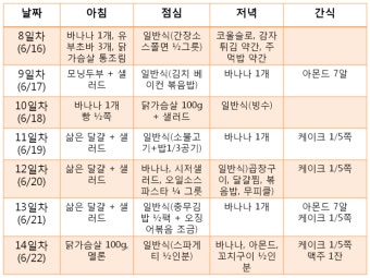 | 일요일 | 현미죽 + 김 + 오이무침 | 불닭 + 상추쌈 + 미역줄기볶음 | 단백질 쉐이크 + 샐러드 |